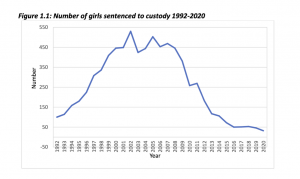 As Dr Goodfellow’s brilliant thesis points out, during this period the number of girls under the age of 18 was at an all-time high, and the rate of incarceration of girls had increased much more quickly than that for boys in the early 2000s. The table below is taken from her thesis.